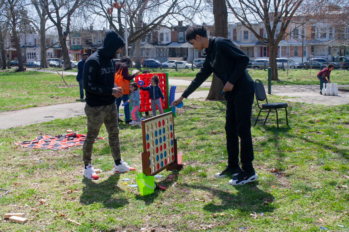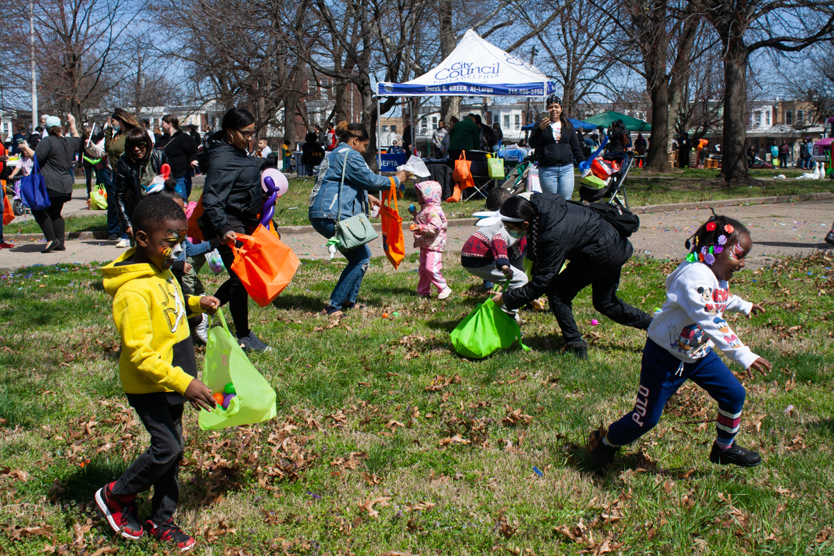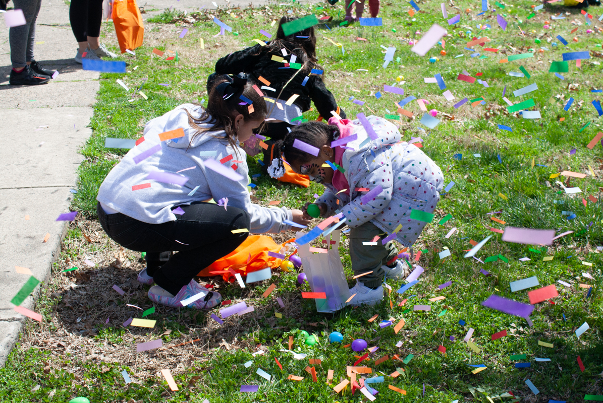 La muy esperada búsqueda del huevo de Pascua comenzó oficialmente con un cañón lanzando lluvias de confeti de color arco iris y biodegradable al aire. Al sonido del cañón, los niños cayeron rápidamente al suelo para recoger los coloridos huevos de Pascua llenos de dulces. Había 2,400 huevos esparcidos en el césped en el lado sur del parque, según la presidenta de la Asociación Cívica de Harrowgate, Shannon Farrell-Pakstis. A pesar del carácter competitivo de la actividad, algunos niños todavía se ayudarán a unos a otros a encontrar los huevos.