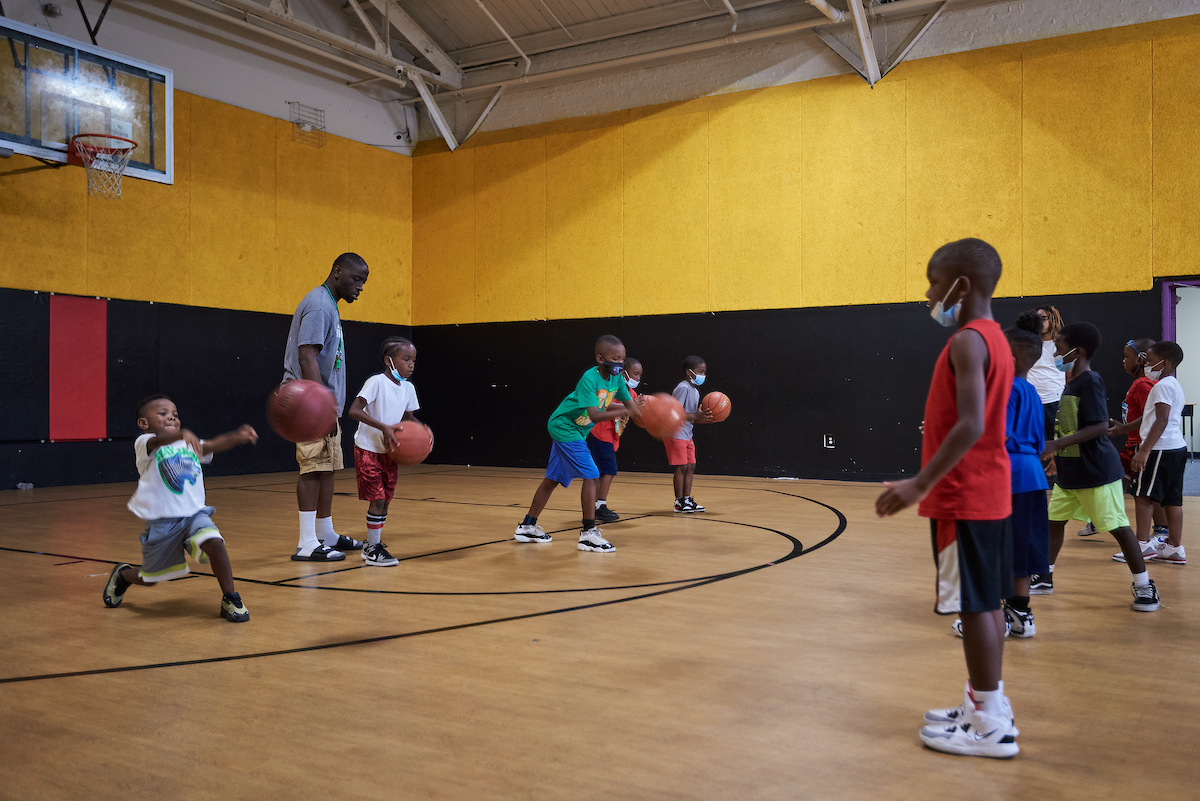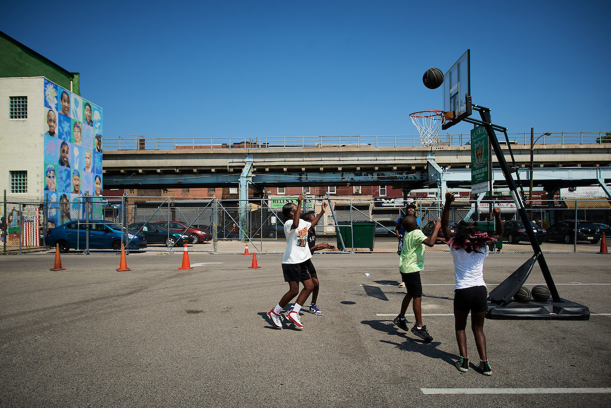 Los campistas juegan baloncesto en la cancha al aire libre en el décimo campamento anual de baloncesto del concejal Isaiah Thomas en Sankofa Freedom Academy el 10 de agosto de 4. (Foto de Albert Yee para Kensington Voice)