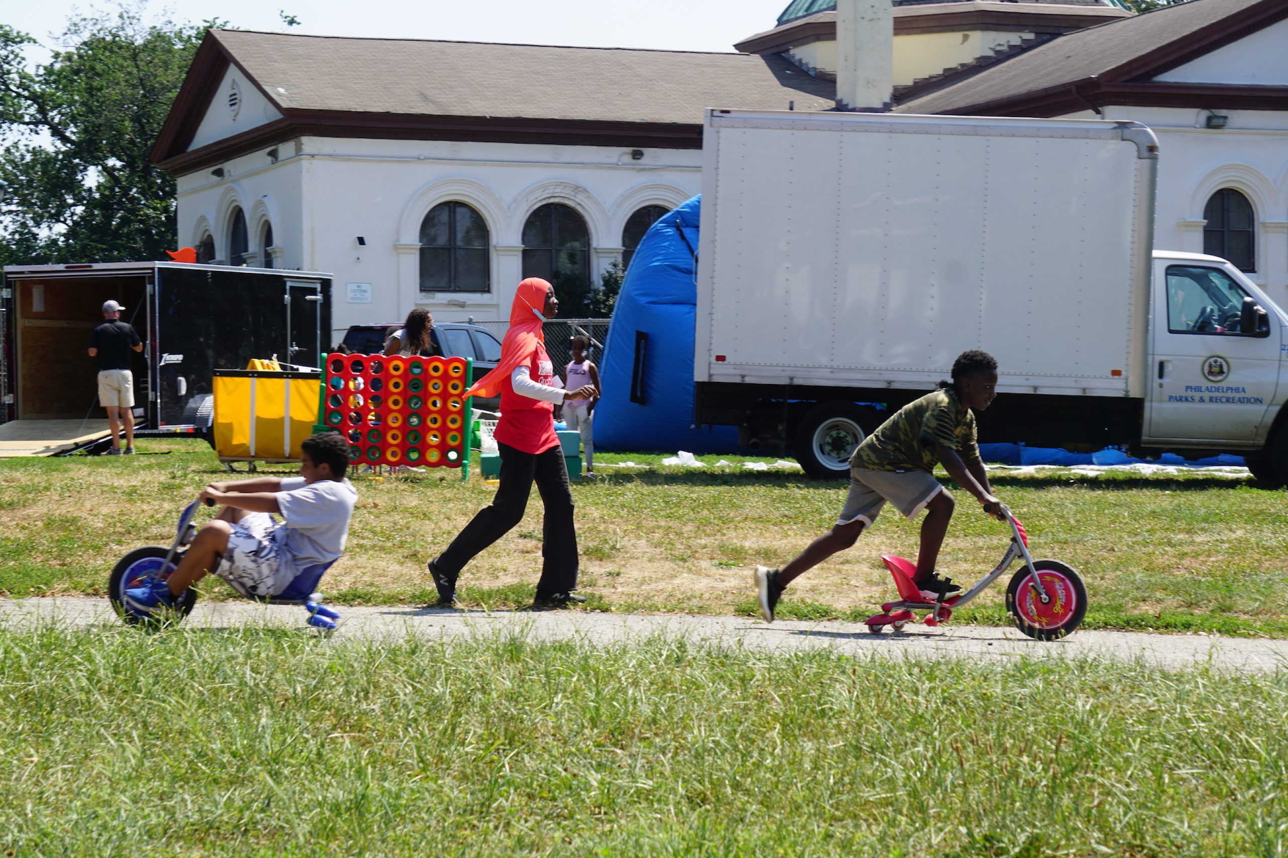 Durante 45 minutos, los niños en la cuadra 1900 de la calle Thayer en el vecindario Kensington de Filadelfia están teniendo un día de juegos de verano por excelencia. El hidrante está abierto y brotante, y los niños con sus camisetas empapadas corren a lo largo de la cuadra como si fuera un campo de fútbol. Una ronda animada de “keep-it-up” provoca gritos y chillidos de los jugadores mayores mientras un par de niños pequeños descalzos bajan de sus porches. Miran con cautela la acción y luego dirigen su atención hacia un montón de hula-hoops.