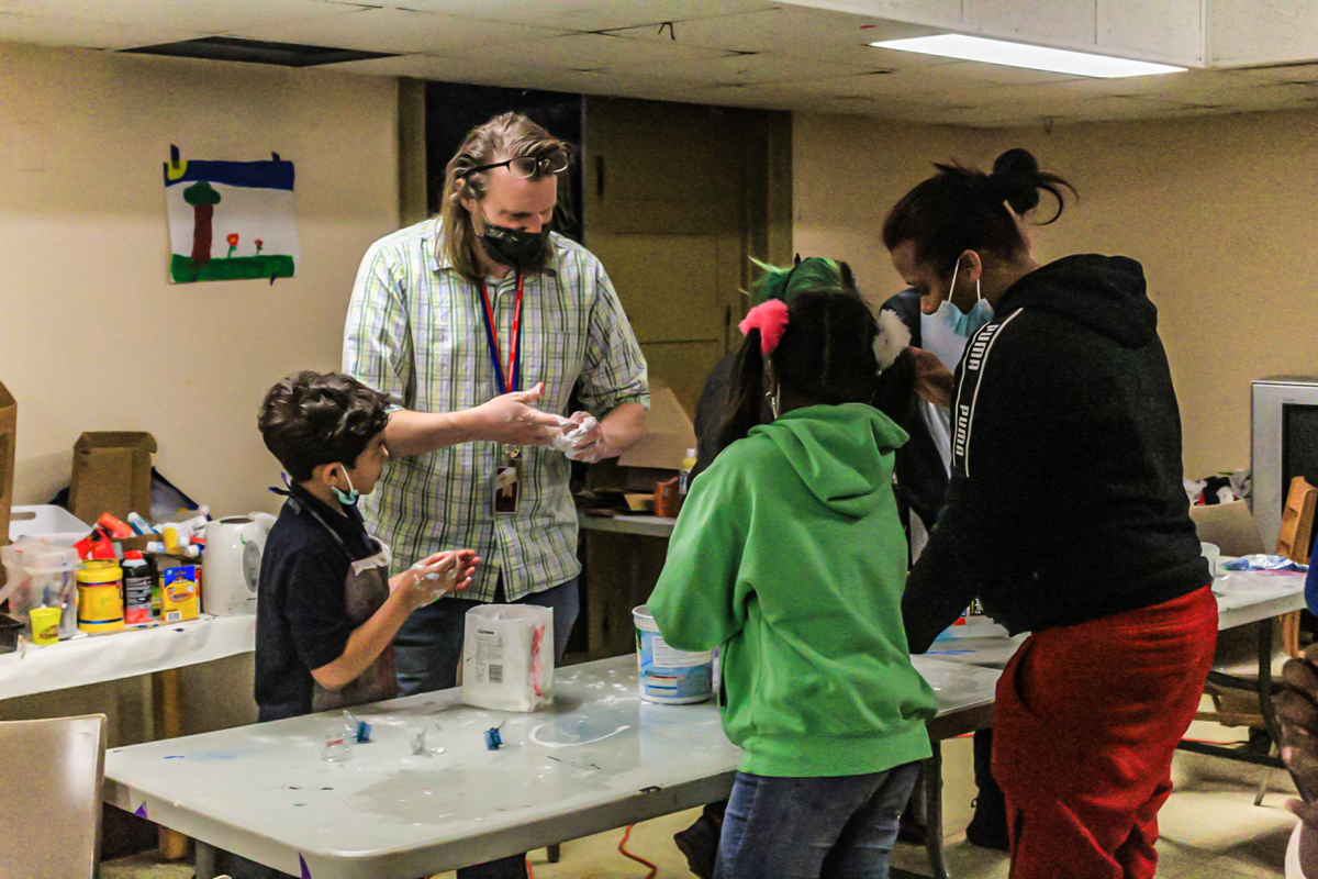 Dentro de la biblioteca, hay muchas computadoras y un tablón de anuncios cubiertos con folletos de programas de la biblioteca y la comunidad junto con trabajos y otros recursos. Por supuesto, la biblioteca tiene muchos libros. Pero si baja las escaleras, verá una sala dedicada a diferentes programas, como costura y jardinería en una incubadora que los estudiantes ayudarán a crear. Al otro lado del sótano está la cocina donde los niños y adolescentes que tienen hambre pueden venir a comer algo o llevar comida a sus familias. Muchos de los niños que participan en los programas extracurriculares vienen día tras día y se quedan hasta que cierra la biblioteca. Luego salen al parque infantil con adultos de confianza y otros padres que los vigilan hasta que es hora de irse a casa.